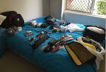 (Learning to pack for an unknown length of time bike trip isn’t easy. From a house full of possessions to 3 bags!)