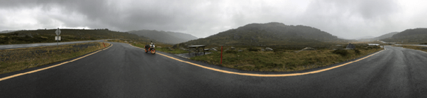The rain kept off enough for me to ride to the end of the road, go for a quick looksy at the end of the Pass’s lookout, and start heading back. I was taking the last of the panoramic photos when the heavens opened up again, where you would see the sheets of drizzle coming towards you up the pass’s valley. Although unpleasant and cold, I was most glad for the weather as this would have been keeping everyone away.
