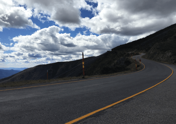 But it was still fun, and soon I noticed the white lines on the edge of the road, changed to yellow. The vegetation became a little more dense of nude, ghost gums, the road got twistier, more windy and the road snow delineators came into view. Massive yellow posts, showing the way for traffic as not to drive over a cliff in a white out. I was now into the snowline! Riding on the ridge of mountain ranges, with the wind now cold, cutting through the layers.