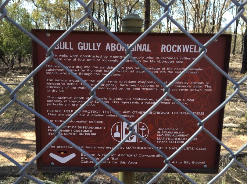 “A set of four Aboriginal rock water wells can be found just off Wells track at Bull Gully, just outside Maryborough. These wells are generally thought to be the best example of Aboriginal rock wells in Victoria. Four holes have been excavated into the base of a large rock in a position which makes them a natural catchment for rainwater falling on the rock above. Three of the holes are joined together within the rock, creating one large cavity. The total holding capacity of these wells is 168 litres. Due to the lack of permanent creeks, Aboriginal people depended on the rock wells for drinking water when they passed through the region. The openings to the wells were covered with flat rocks to prevent evaporation and pollution of the water within.”