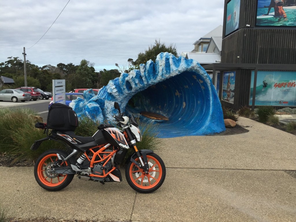 As the winds kept picking up more and more, temperatures were dropping, I rode around to the protected area of the island towards Cowes, where there are plenty of cafes, and racing and biking memorabilia. I did a lap of the shops and brought a t-shirt or two from one of these shops with Phillip Island track logo. When in Rome…