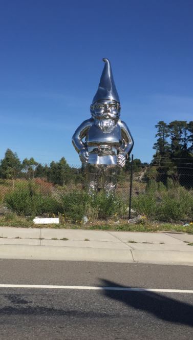 Saddled up and kept riding south, and only realised there was another WTF random BIG thing – the ‘Chrome Gnome’ behind a fence that looked like a land lot that was getting ready to be developed…? I had no idea what it was or represented, but it’s going in my collection. 🙂