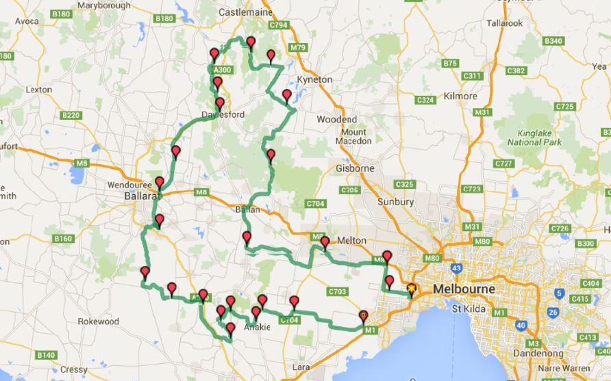 Someone’s creativity showing as part of their elaborate mail box at Brisbane Ranges National Park. And finally swinging east past Werribee and through Melbourne city (in the distance). I was dropped off after another wonderful (but cold) day, exploring new places and doing it in style!