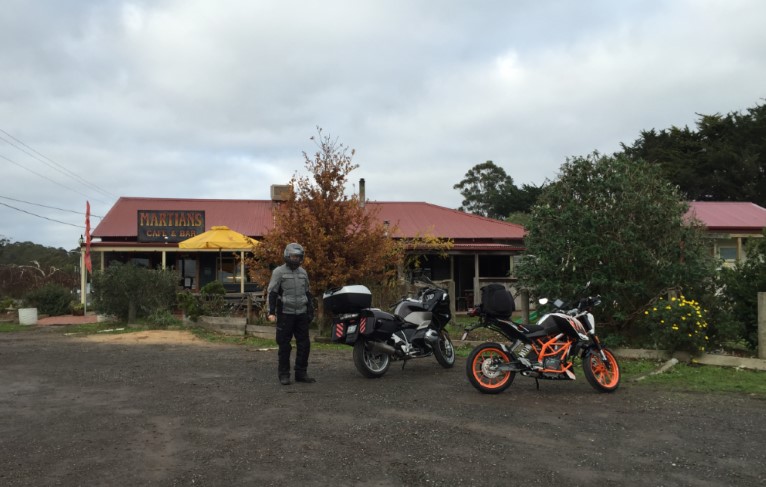 The route was to cross Melbourne city, hightail it towards Geelong, and then off to the Great Ocean Road and surrounds for some fun in the hills. I struggled to keep my excitement below red(lining) levels on the poor bike, while also being humbled that I was being able to ride my own behind such suave and elegant BMW beast. The sheer size difference between the bikes was stark so much so that it made my Lawnmower look like a toy next to it! He certainly had fun at one stop by jumping bikes and giving the Lawnmower a red hot go 🙂